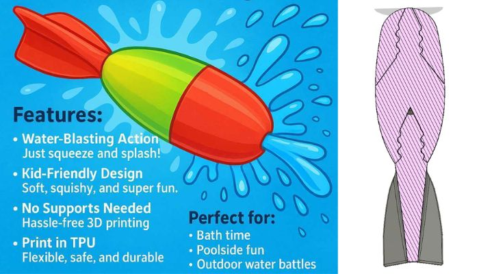 Quer se divertir sem gastar com brinquedos novos? Experimente o Splash Rocket! Ele é fácil de imprimir e seguro para crianças e adultos. Mistura peças rígidas e flexíveis para armazenar e lançar água.